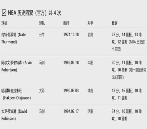NBA官方承认的四双,历史上只有4次:瑟蒙德22分14篮板13助攻12盖帽;埃尔文-罗伯特森20分11篮板10助攻10抢断;奥拉朱旺18分16篮板10助攻11盖帽;大卫-罗宾逊34分10篮板10助攻10盖帽。罗伯特森是唯一的抢断四双!