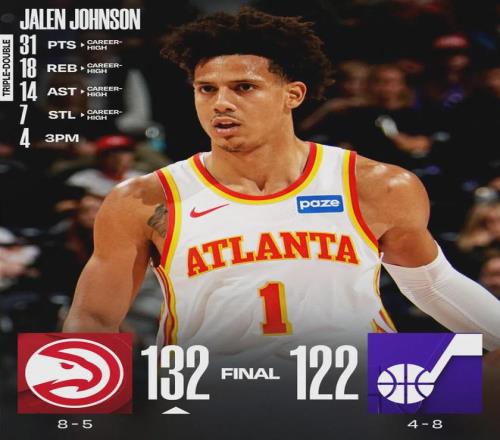 在特雷杨长期缺阵的情况下,老鹰能排在东部前五,已经超出很多球迷的预料。这离不开其他球员的爆发:昨天老鹰132-122战胜爵士,杰伦-约翰逊19投10中,三分5中4,罚球11中7,狂砍31分18篮板14助攻7抢断,差3次抢断达成四双。