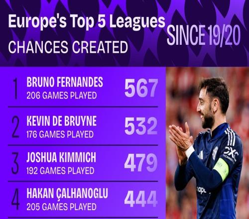 1920赛季起五大联赛创造机会榜:B费567次第1,丁丁532次第2